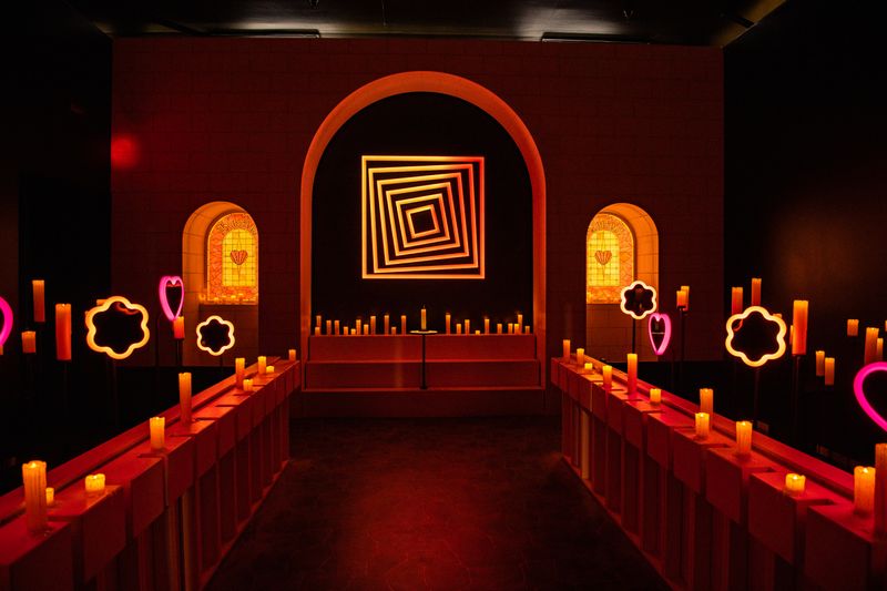 The other exception is the Blackout chapel, a candle-lit space dedicated to Spears’s 2007 cult album. As Blackout plays on loop, you can pray to Godney at a stained-glass altar that lights up when you kneel in front of it. Shockingly — or not, depending on how big of a Blackout stan you are — Delson says they’ve already gotten requests from fans who want to get married there.